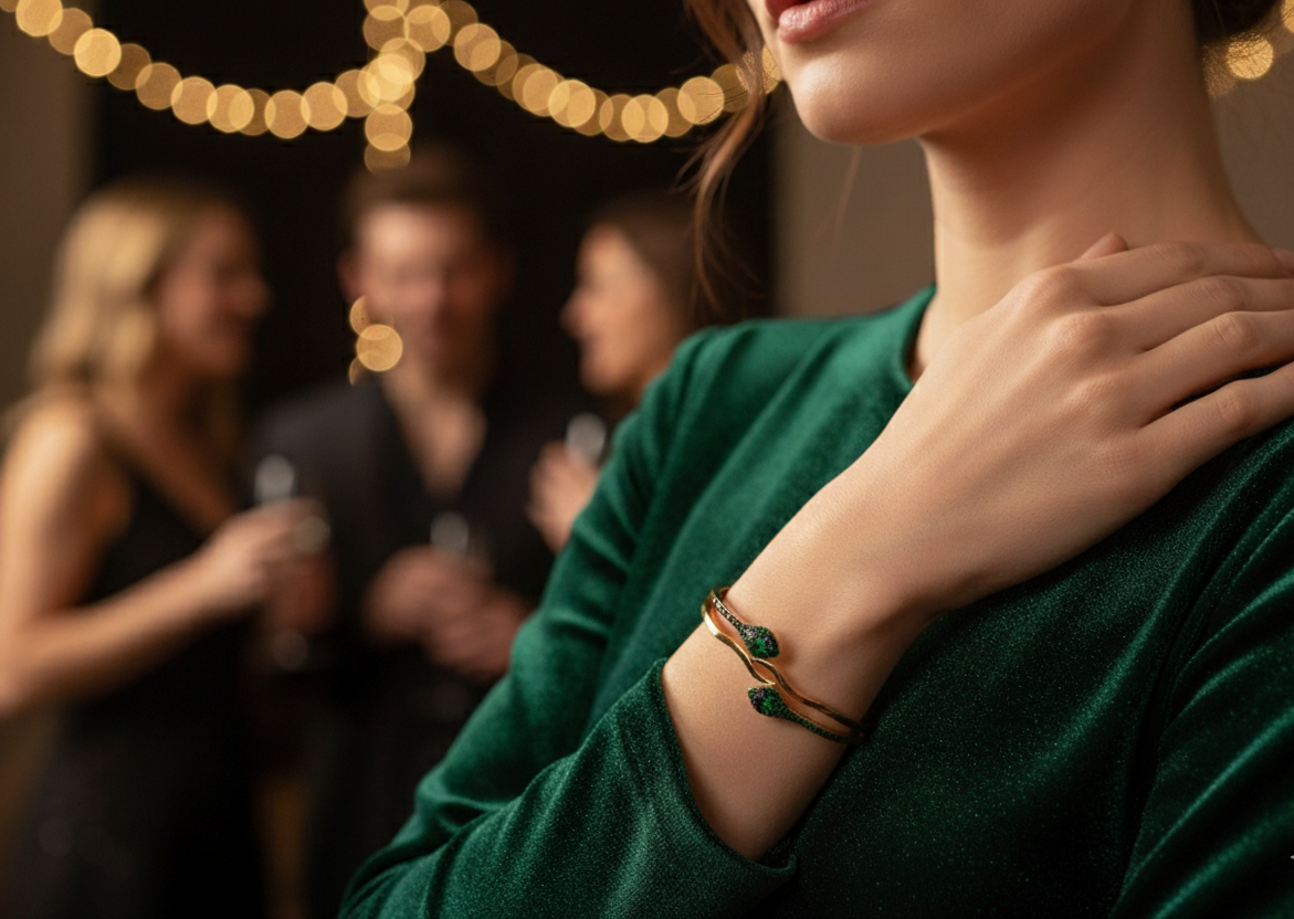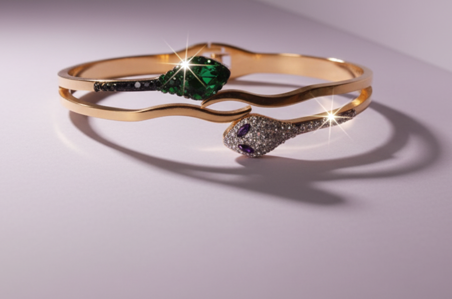 Unique Design: Snake-inspired shape with dazzling gemstones (green and White) for a bold, stylish look.