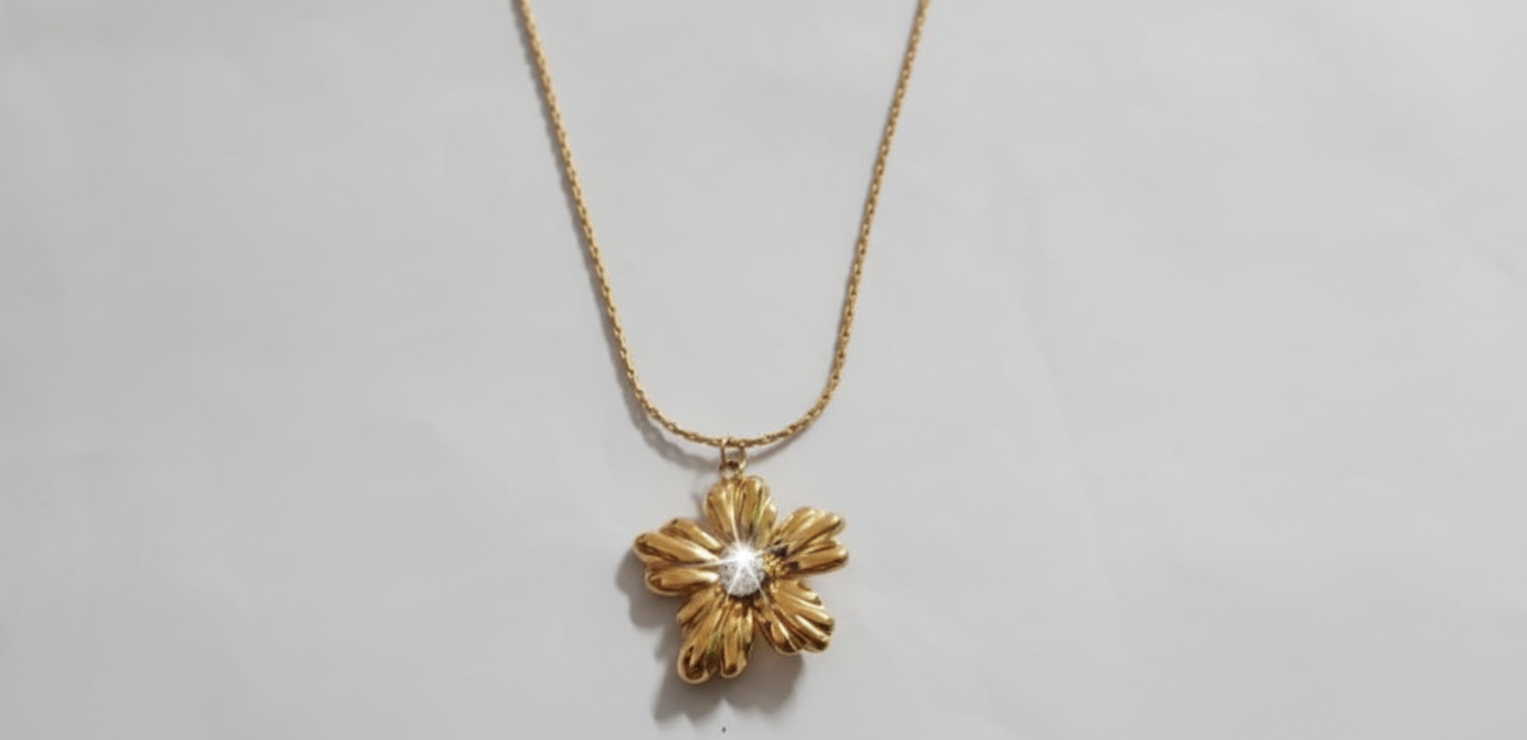 Enhance your jewelry collection with this stunning Gold Flower Pendant Necklace for Women, crafted from high-quality stainless steel. With a radiant floral charm and shimmering center, this necklace is both stylish and functional—perfect for daily wear or special occasions.